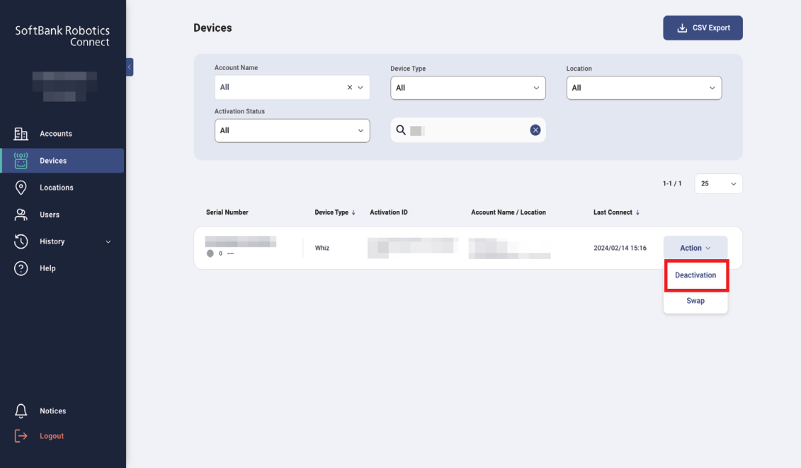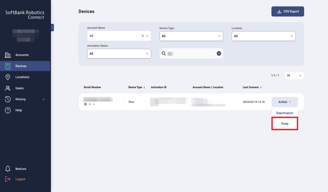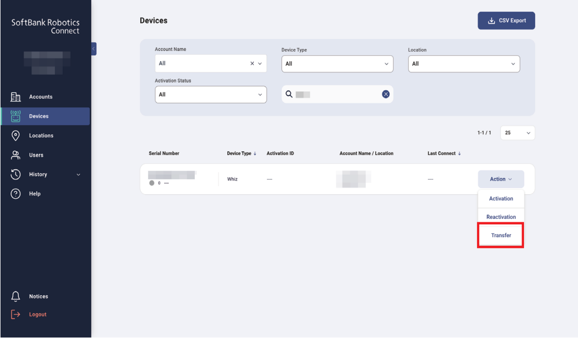 - In the Device List, click “Action” for the robot to be replaced.
