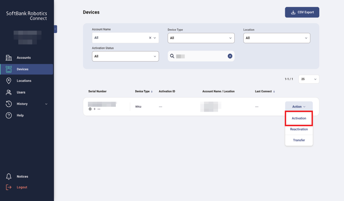 - In the Device List, click “Action” next to the robot.